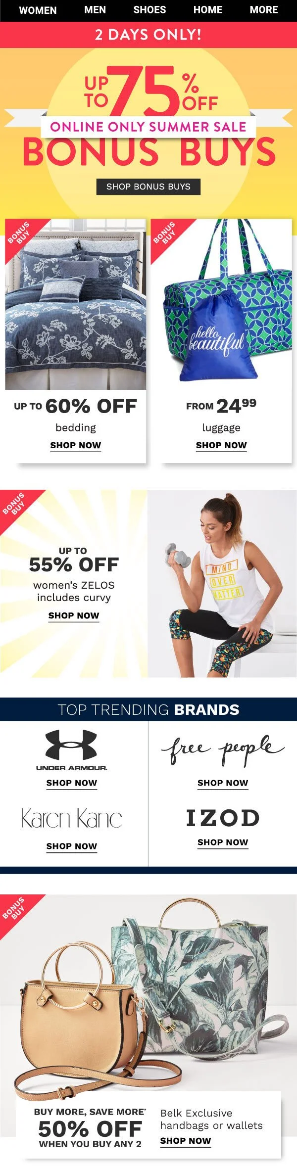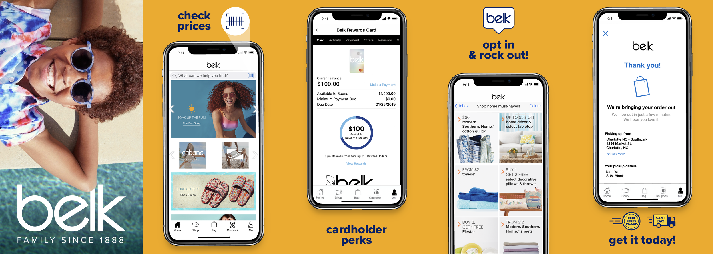 Belk is a department store that focuses primarily on home and fashion. Their stores are primarily in the southern United States, so the tone and design is sometimes inspired by southern culture.