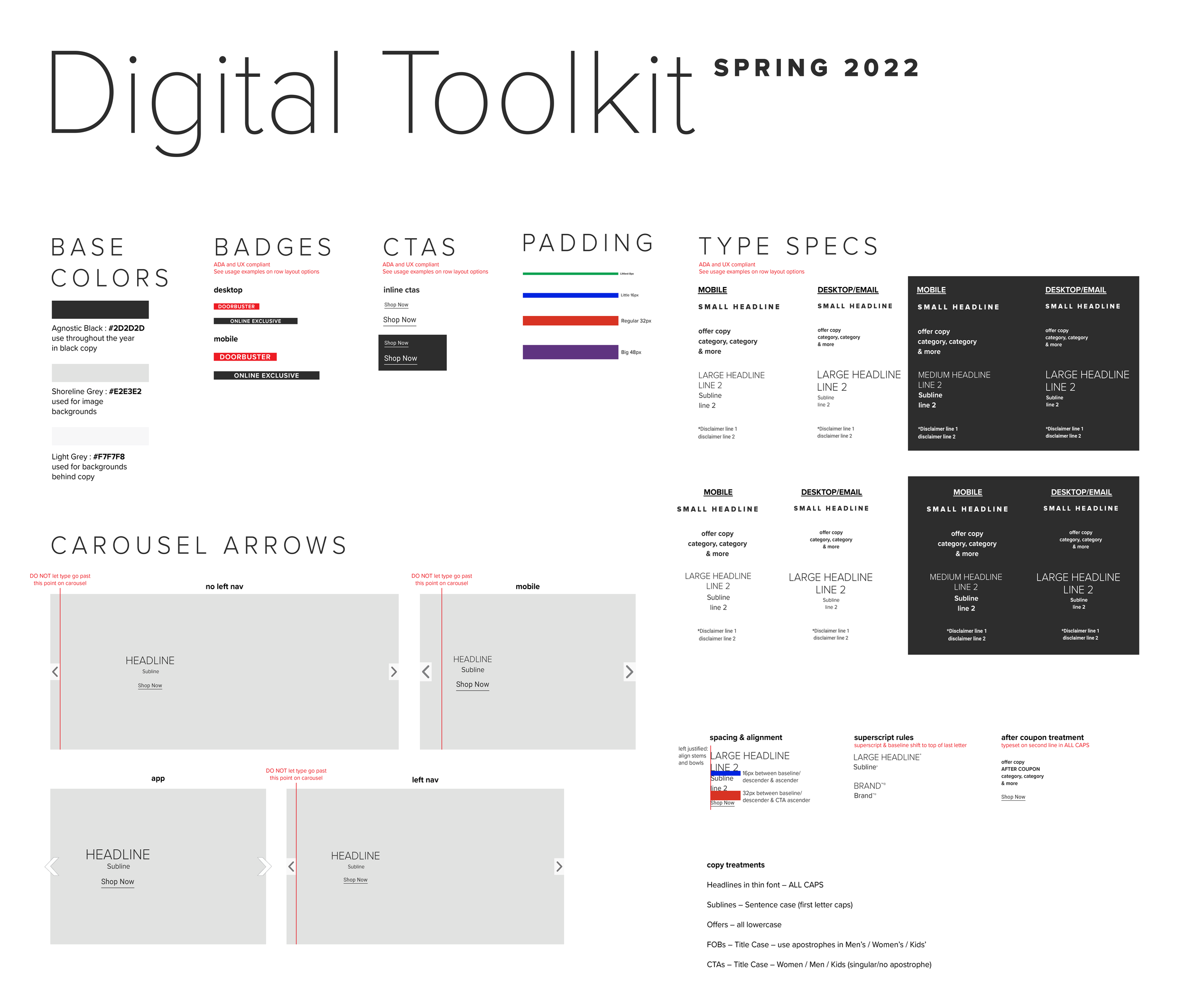 Digital toolkits developed to keep every design clean, consistent and on brand, no matter which designer is assigned to each project.These toolkits include everything from colors, type specs and graphic elements, to layout options, padding guides and copy treatments.