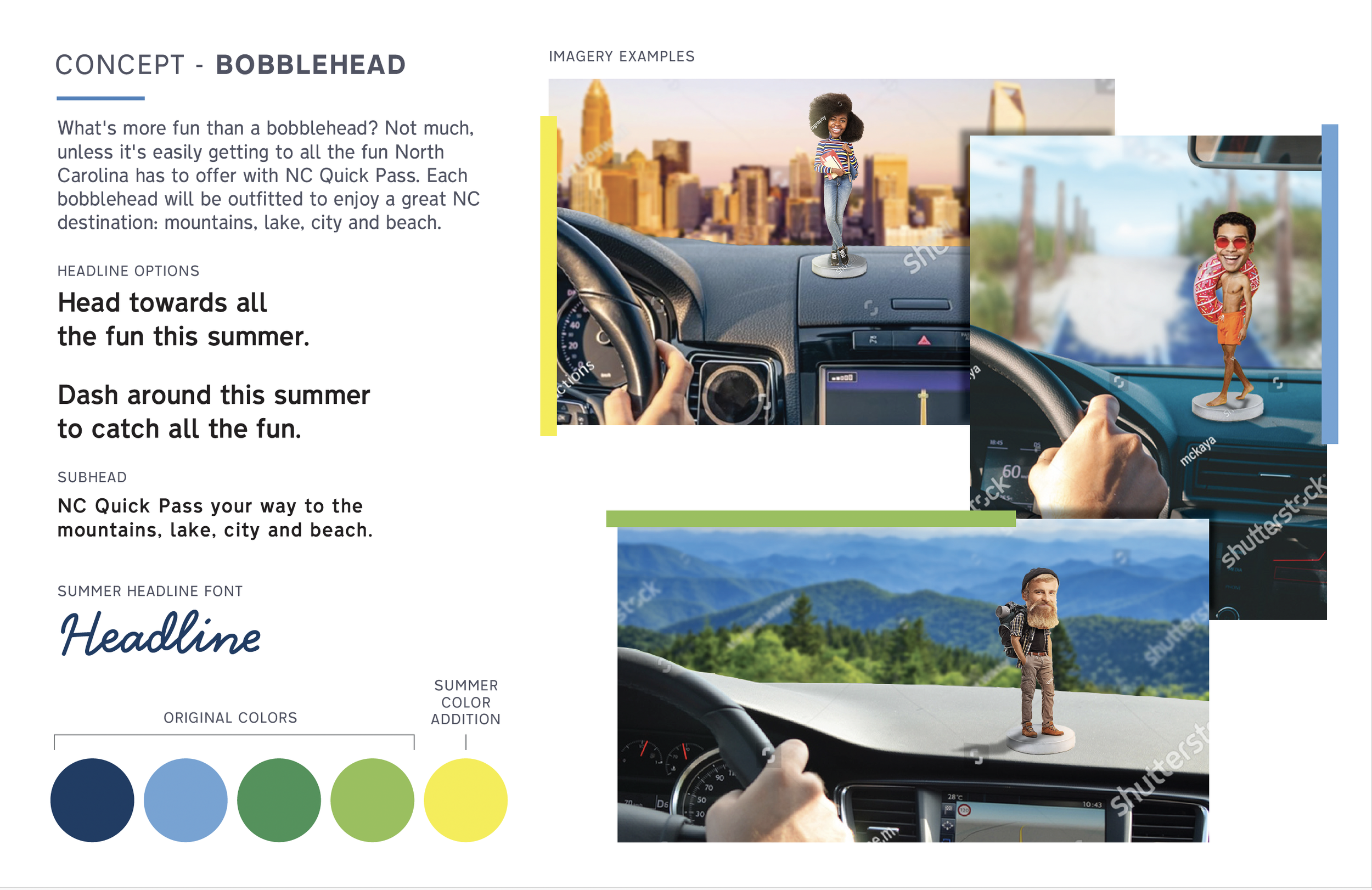 Result: The NC Quick Pass bobblehead campaign is a fun and energetic way to show potential customers how quick and easy NC Quick Pass makes getting to all the fun North Carolina has to offer. Each bobblehead is a representation of the driver, outfitted to enjoy a great NC destination: mountains, lake, city and beach.